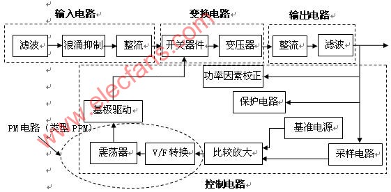 根據控制類型不同,PM(脈沖調制)電路可能有多種形式。這里是典型的PFM結構。